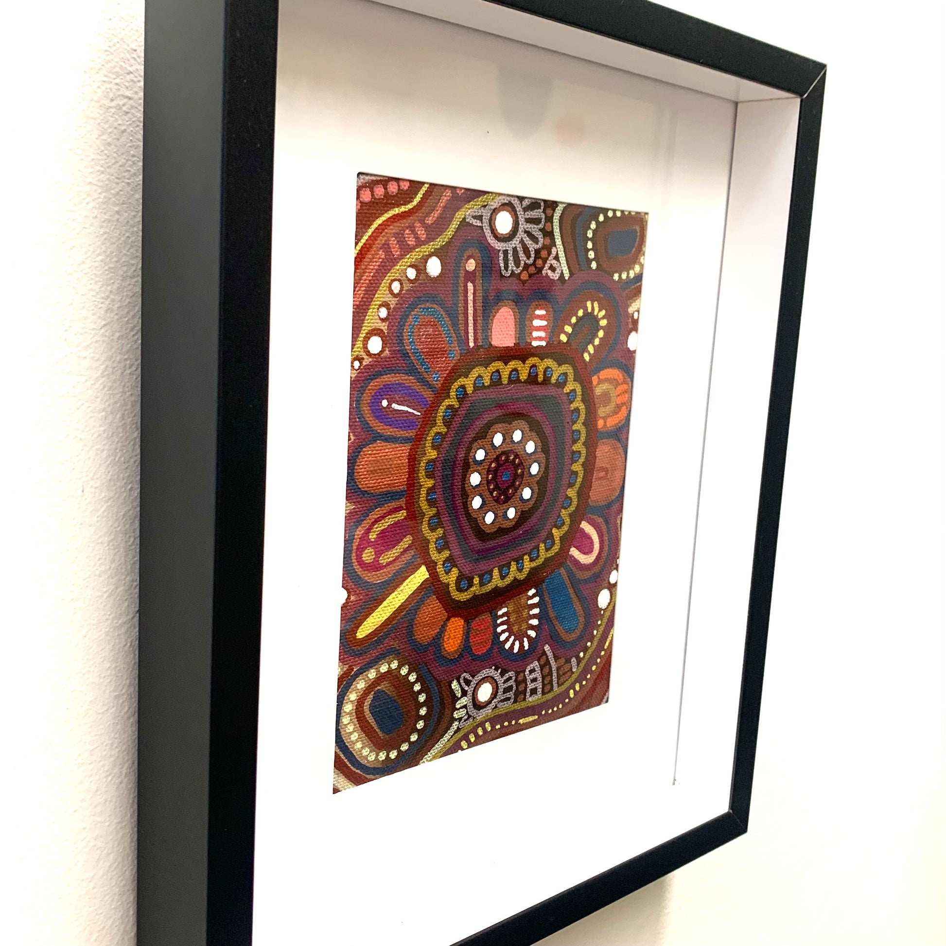 A striking, one-of-a-kind artwork by Art by Gaylee, framed in a sleek black shadow box frame with a white mount to make the artwork stand out, and it's ready to hang or stand. Each untitled piece measures 22 × 27 × 4 cm, making it a perfect size to display on its own or as part of a collection. Contemporary, vibrant, and full of character, these original works bring a touch of culture and colour to any space.