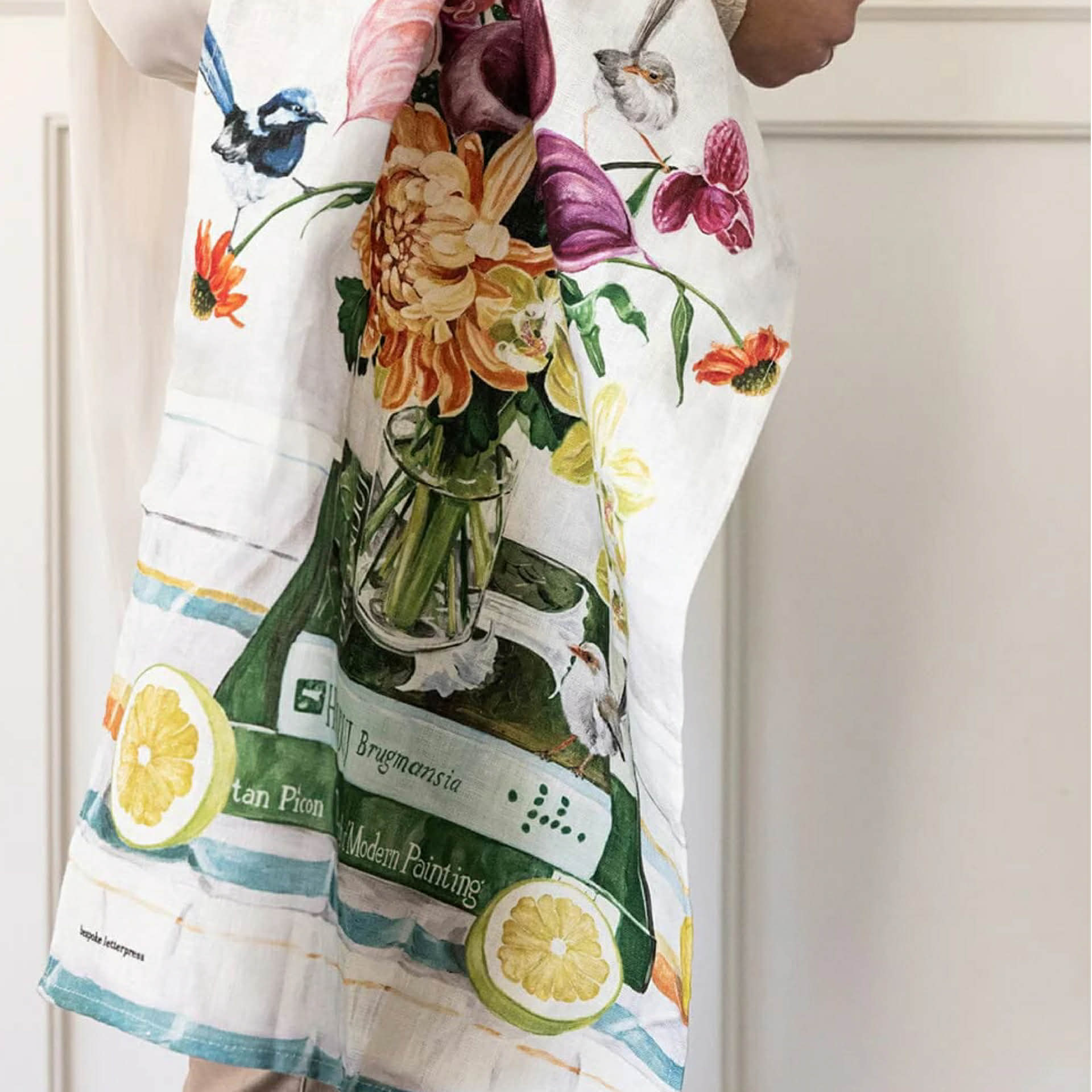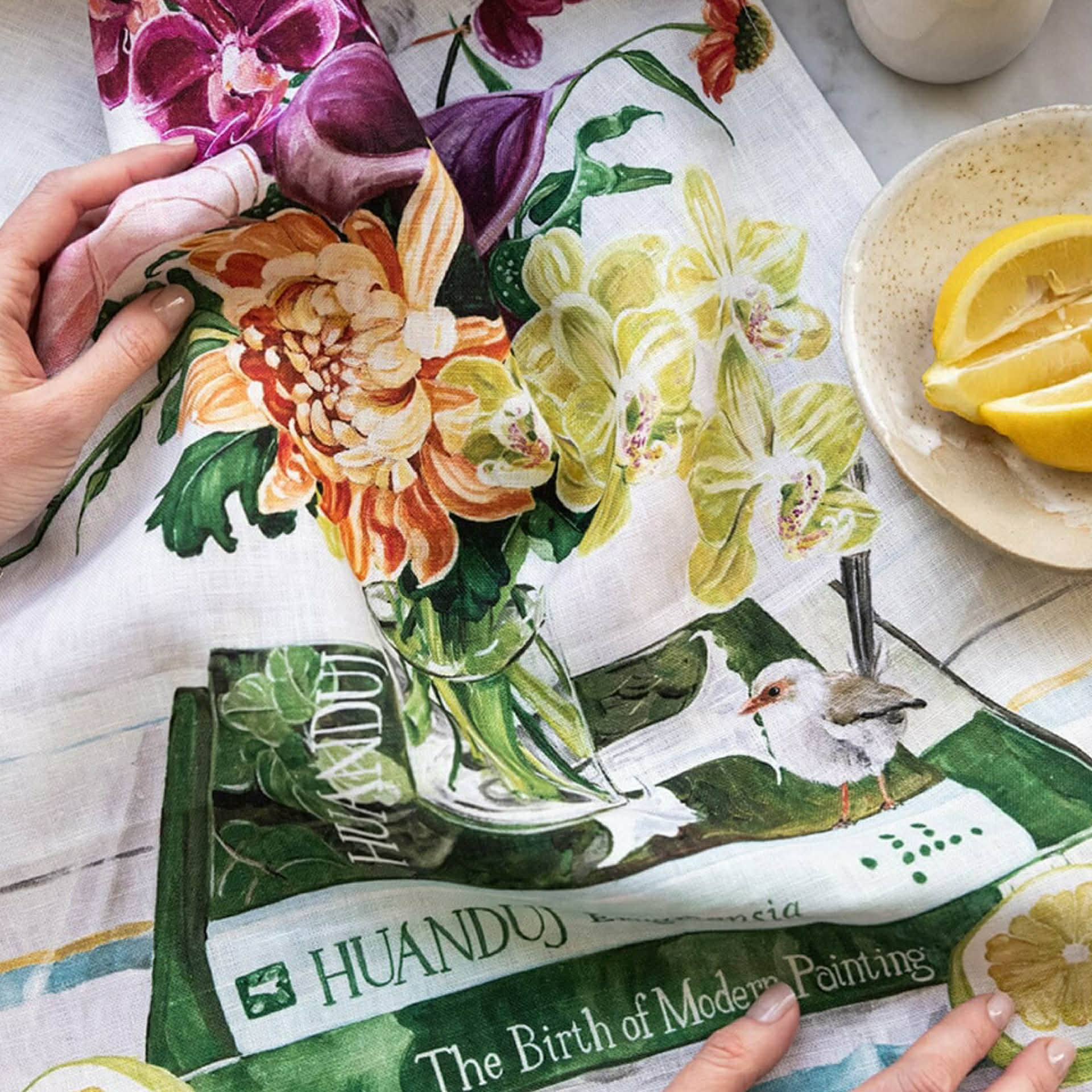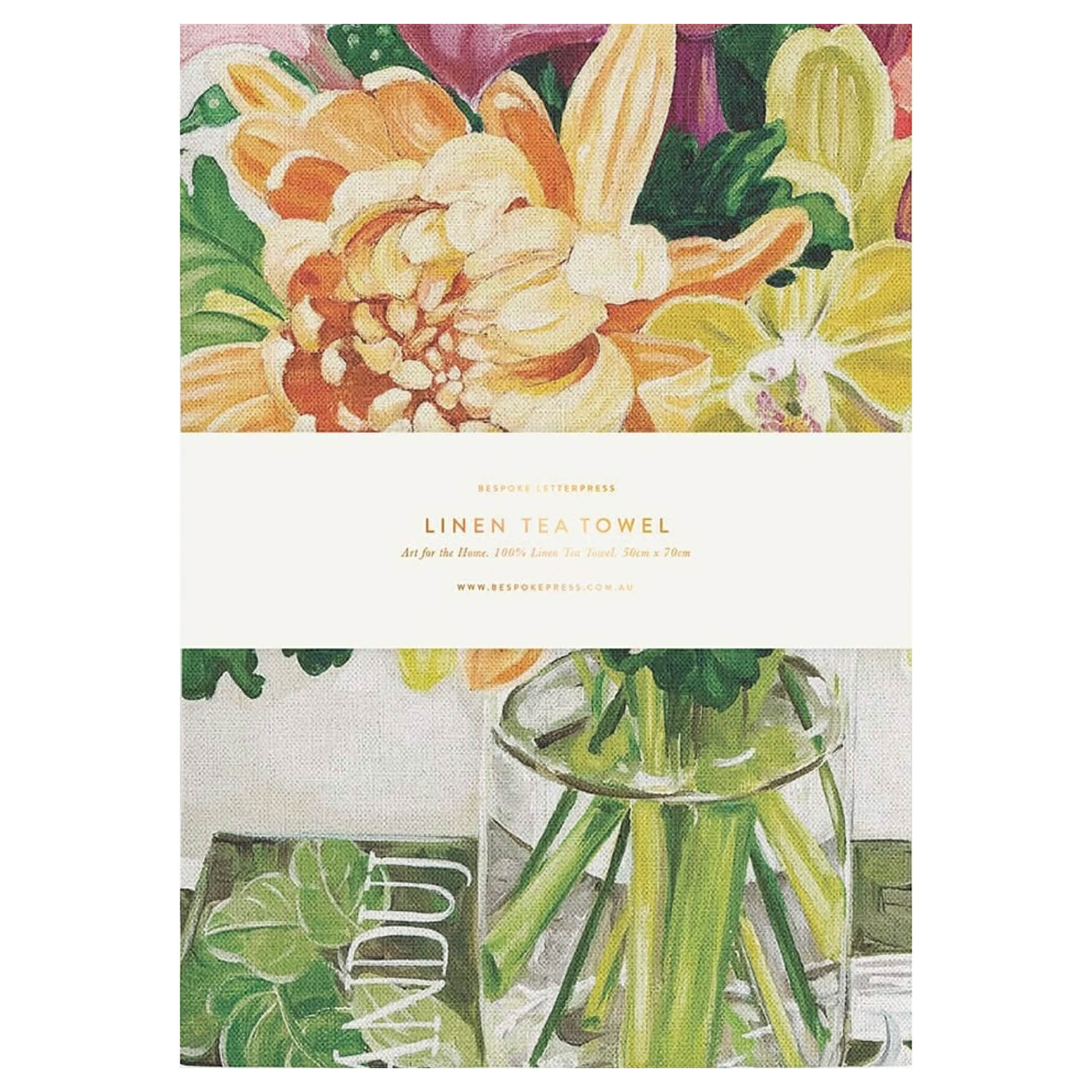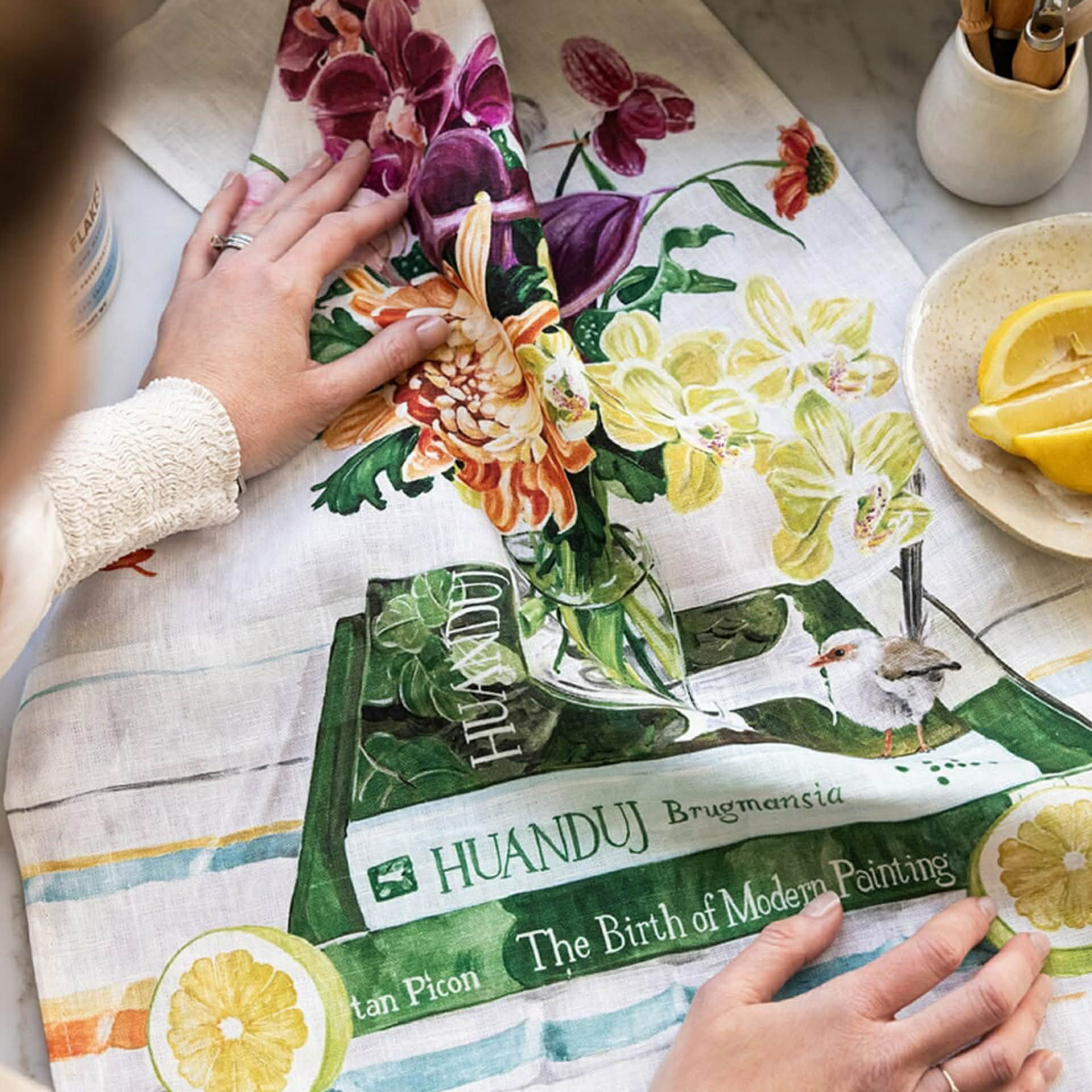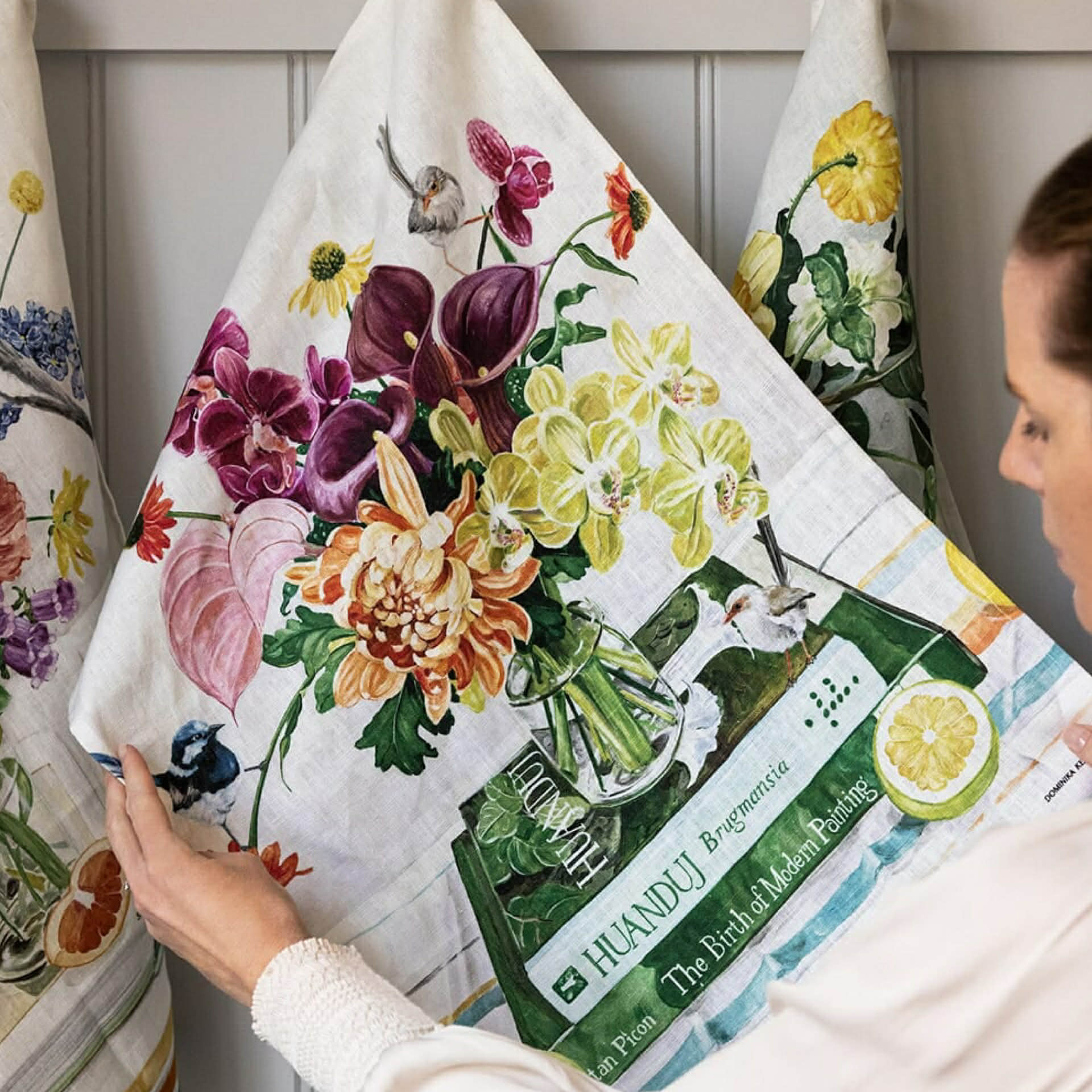 Artwork by Dominika Keller and printed on 100% Linen Tea Towel. Supplied folded with a gold foil printed removable bellyband.