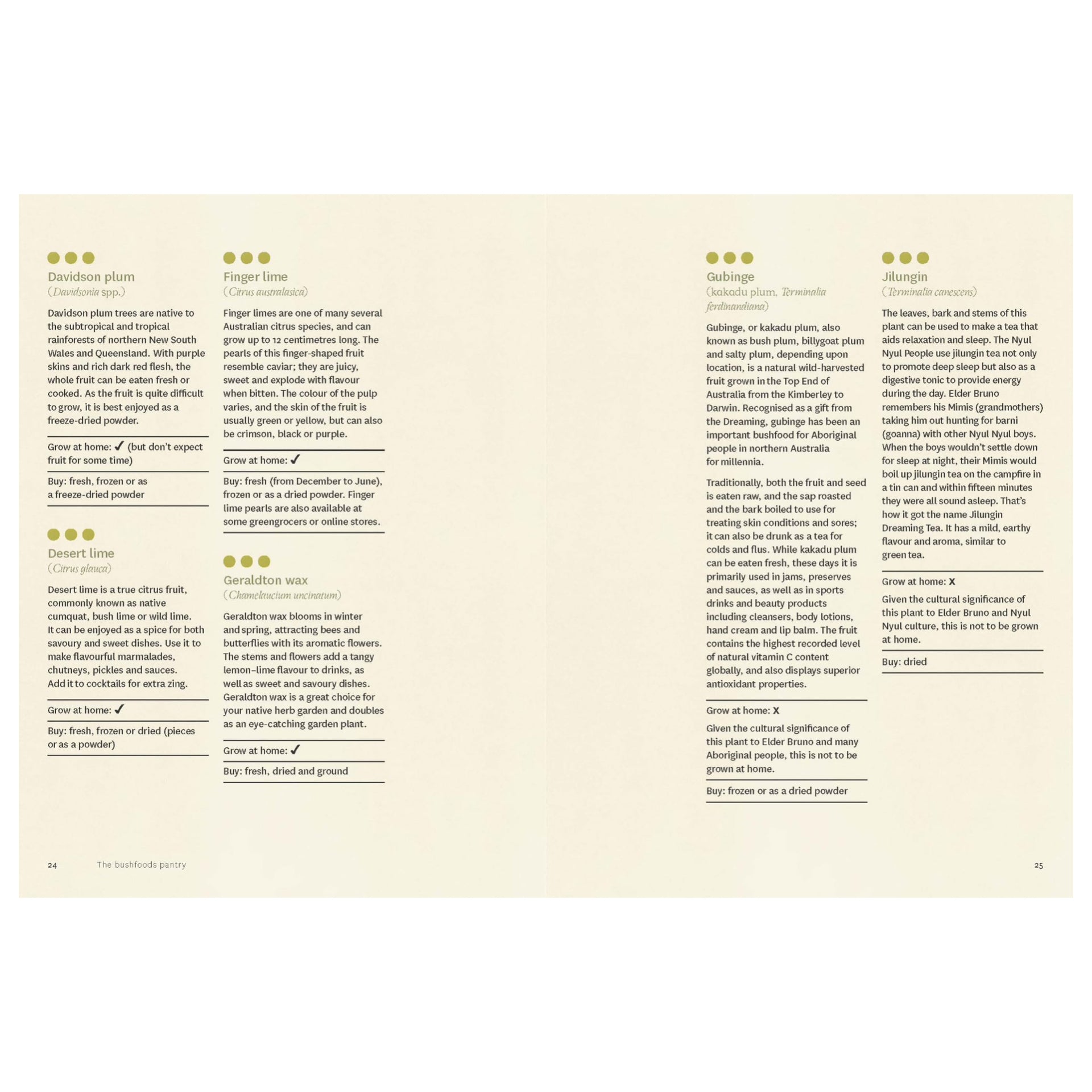 • Meat: Barbecued steak with pepperberry & bush honey carrots; Chilli con kanga tortillas with warrigal greens salsa verde; Easy roast chicken with lemon myrtle, pepperberry & pepperleaf.