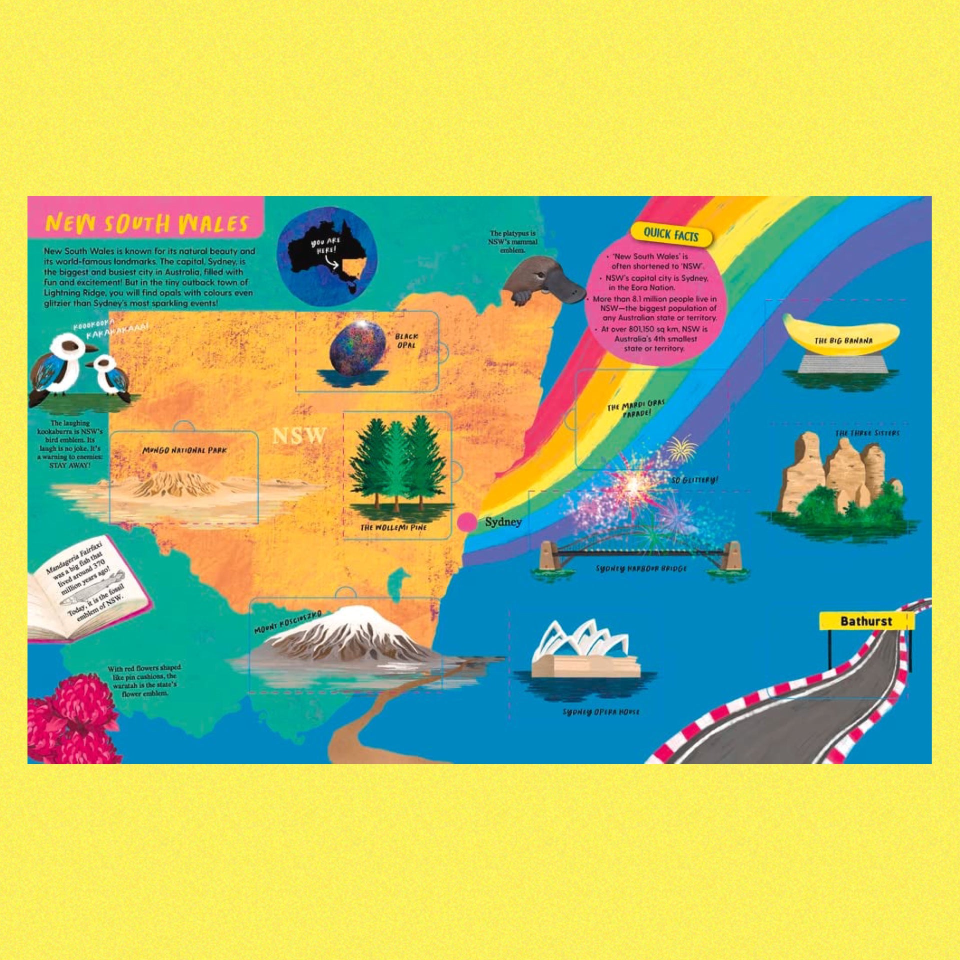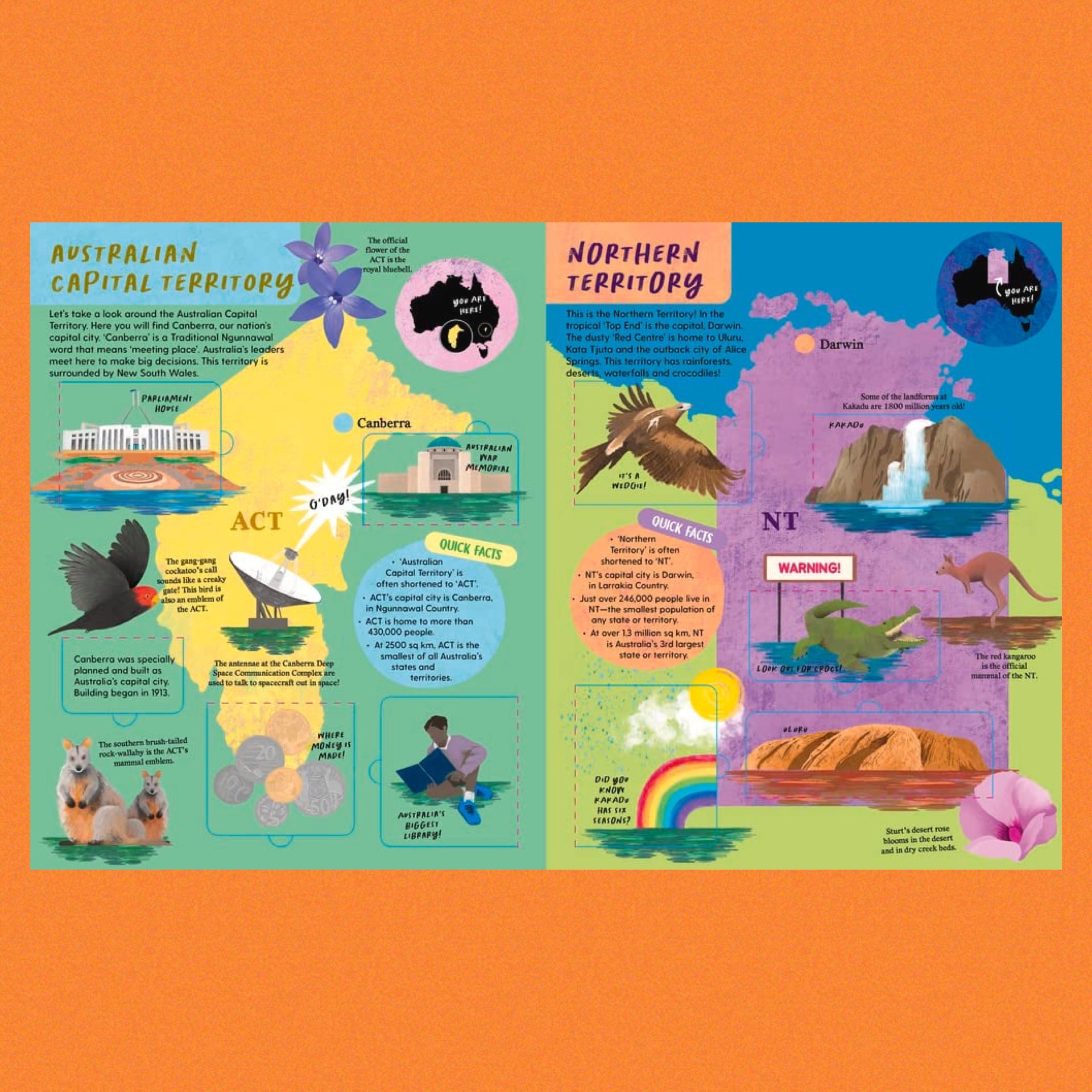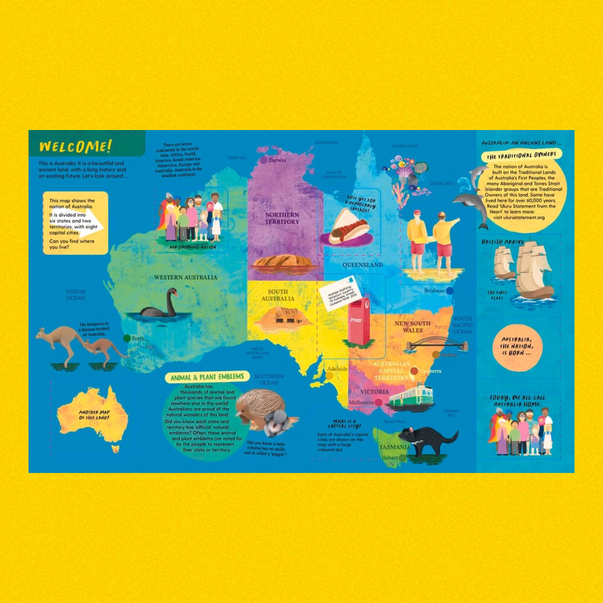 This is Australia. It is a beautiful and ancient land, with a long history and an exciting future. With large, simple maps showing the shape of each state and territory and its capital city, this bright picture atlas is a great introduction to Australia. Filled with gorgeous illustrations and 70 fact filled flaps, this book makes it fun and easy for young children to explore the animals, plants, landmarks and events unique to Australia. Take a look around. Everyone is welcome!