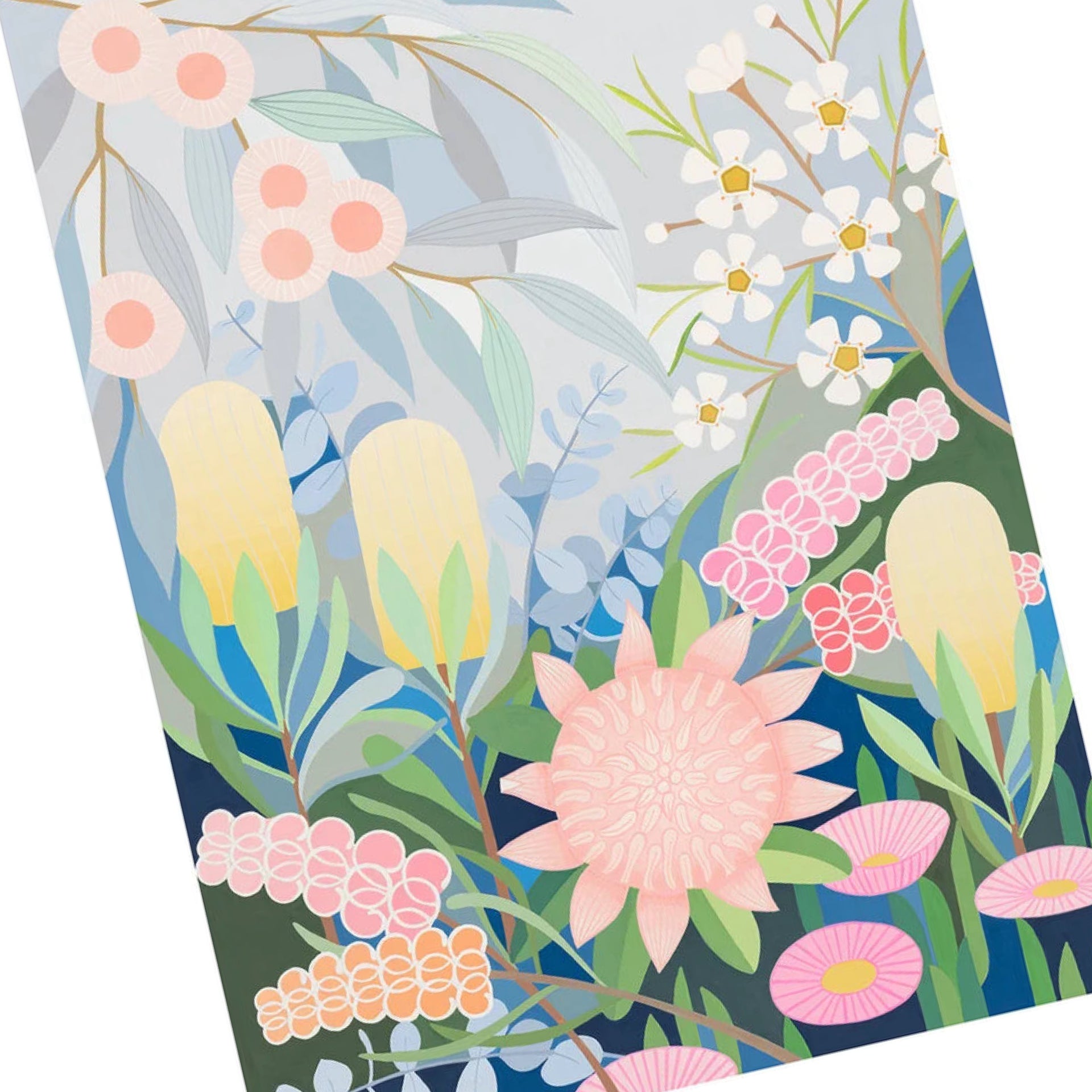 I work from my home-studio here in Adelaide and produce original gouache or acrylic paintings and black and white ink drawings. From these original works, I make limited edition archival reproductions printed on Hahnemuhle Bamboo paper. My work is inspired by Australian natives and other botanic forms and reflects my love of colour, repetition and pattern. I sometimes use flowers and leaves as visual metaphors to express words and thoughts or to convey messages. My style is clean and graphic with crisp edges between colours and small details reflective of my background in jewellery.
