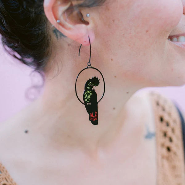DENZ & CO- Red Tailed Black Cockatoo in Colour- DANGLE EARRINGS