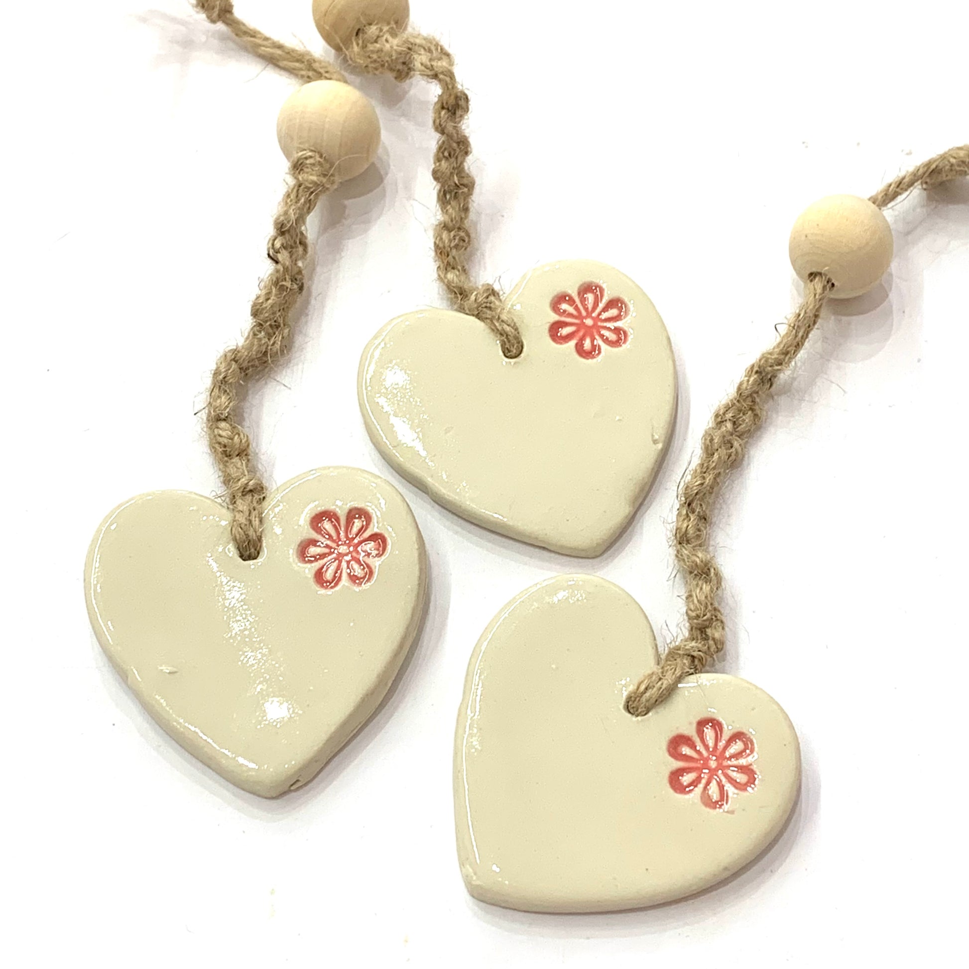 EARTH BY HAND- Clay Heart Decorations- Stamped Flower, Knotted Cord & One Bead