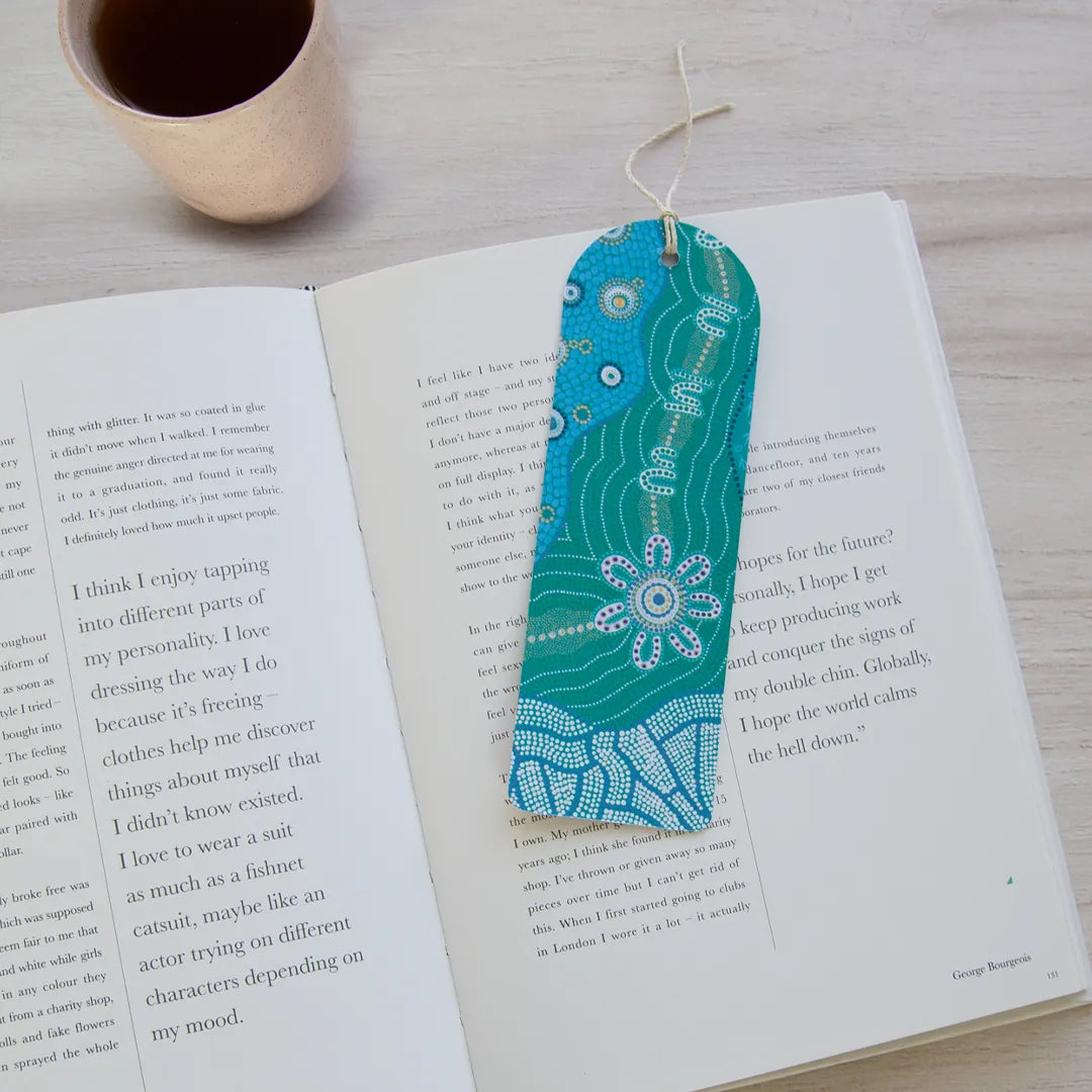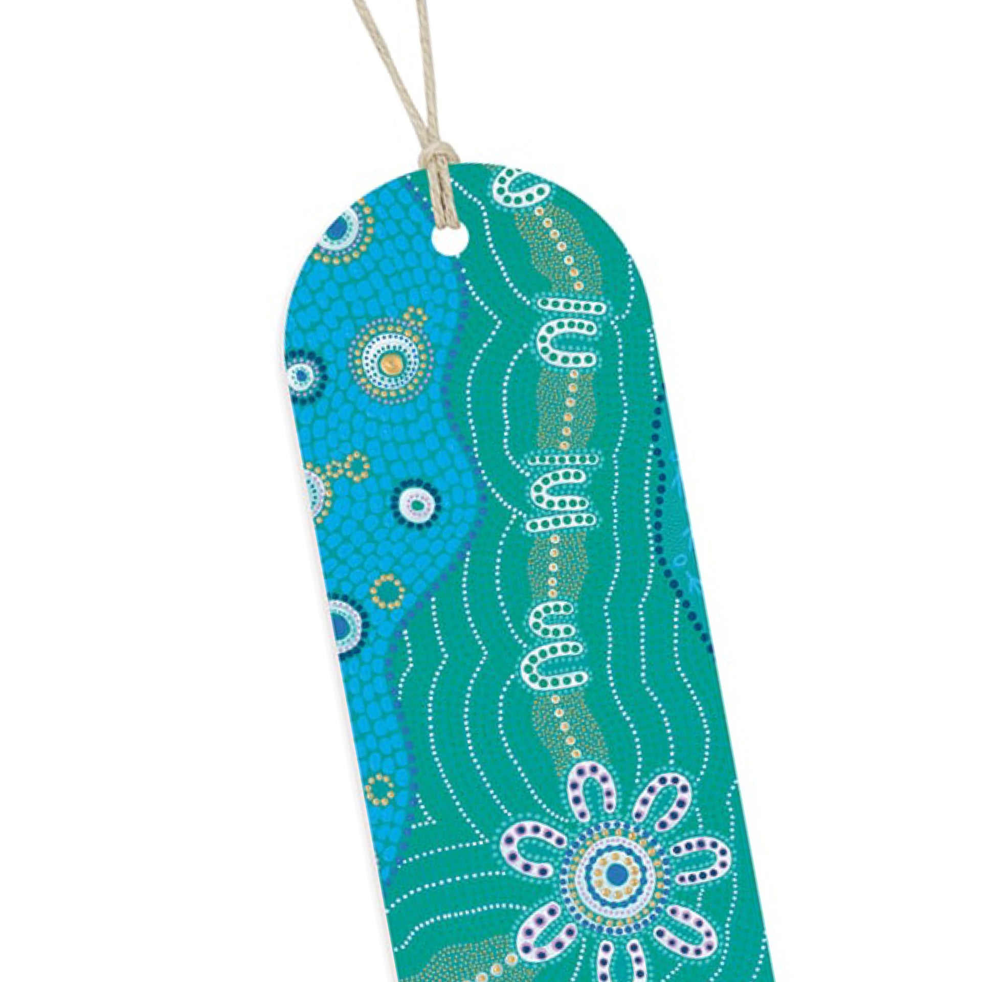 This bookmark comes with a natural hemp string tie and displays inspiring artwork by contemporary Aboriginal artist Domica Hill.