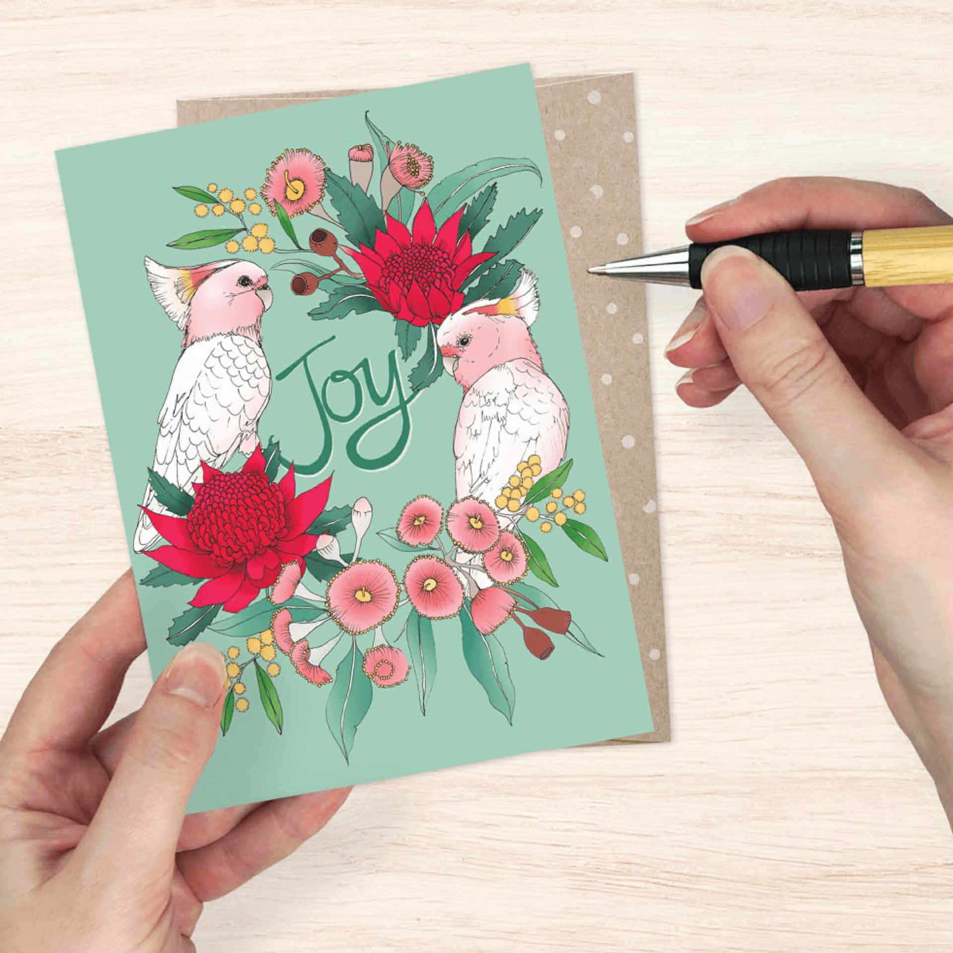 EARTH GREETINGS- Pink Cockatoo Wreath - Christmas Greeting Card - Victoria McGrane