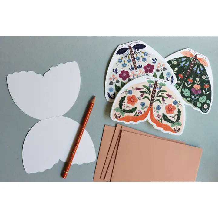 A decorative moth shaped greeting card in blues, greens and yellows, paired with a gently textured terracotta envelope.