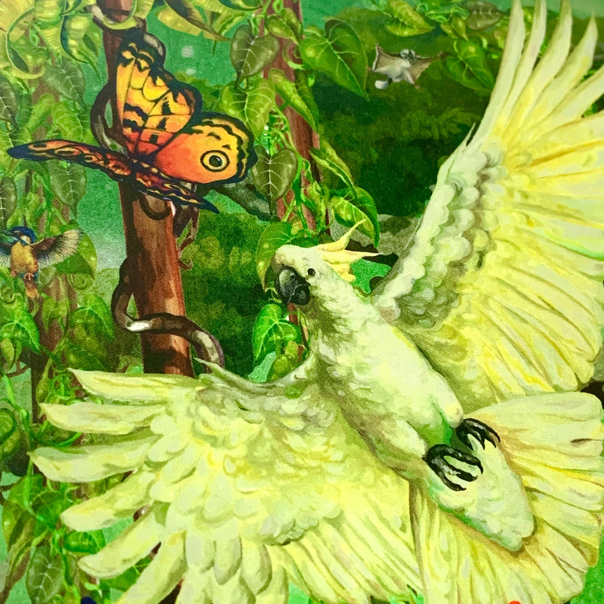 CAIRNS RAINFOREST POSTCARD- A magnificent cocky in flight surrounded by all the colours of the rainforest of our tropical home!