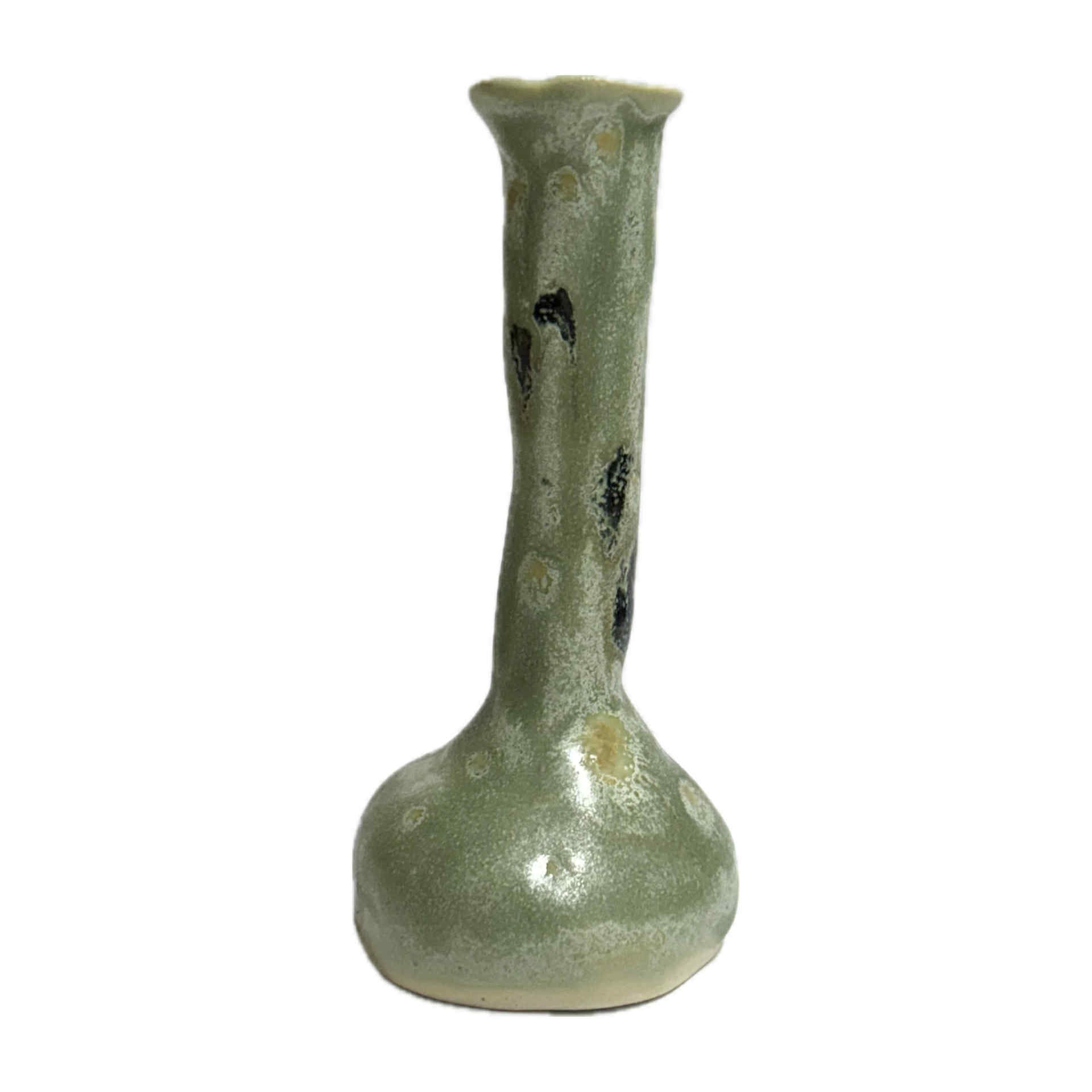 This tall bud vase features aura green with soft black splotches. Textured and unique, made with sandy clay and character in every curve.