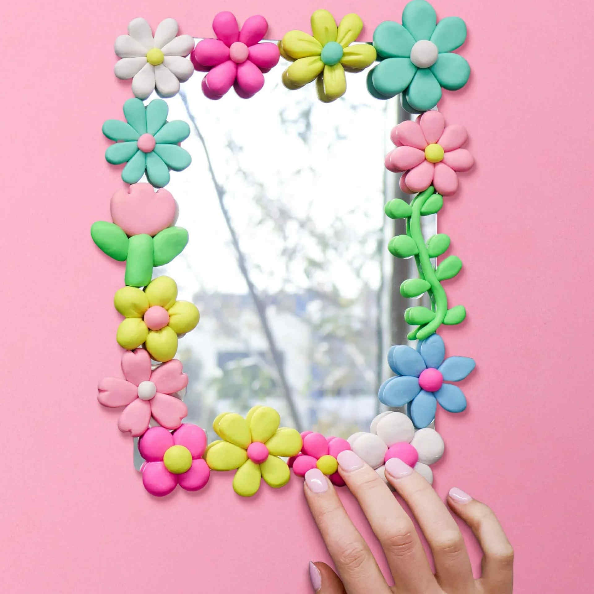 Making polymer clay flowers is easy and fun. Once they are made, arrange and glue them onto your mirror for a look that’s absolutely fabulous.