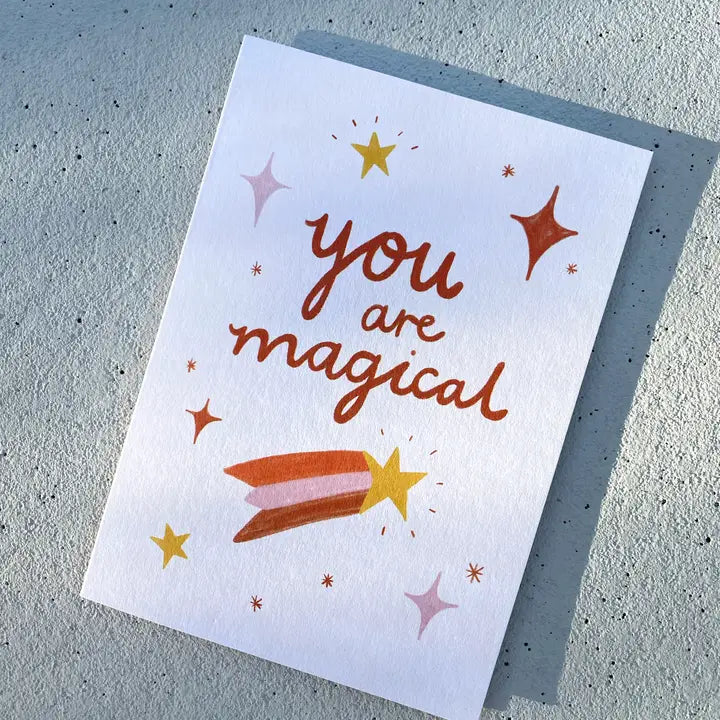 Tell someone how wonderful they are with this illustrated "You are Magical" sparkles and shooting stars greeting card. So many occasions can be covered with cute card, for big or little people! Blank inside for a personal message