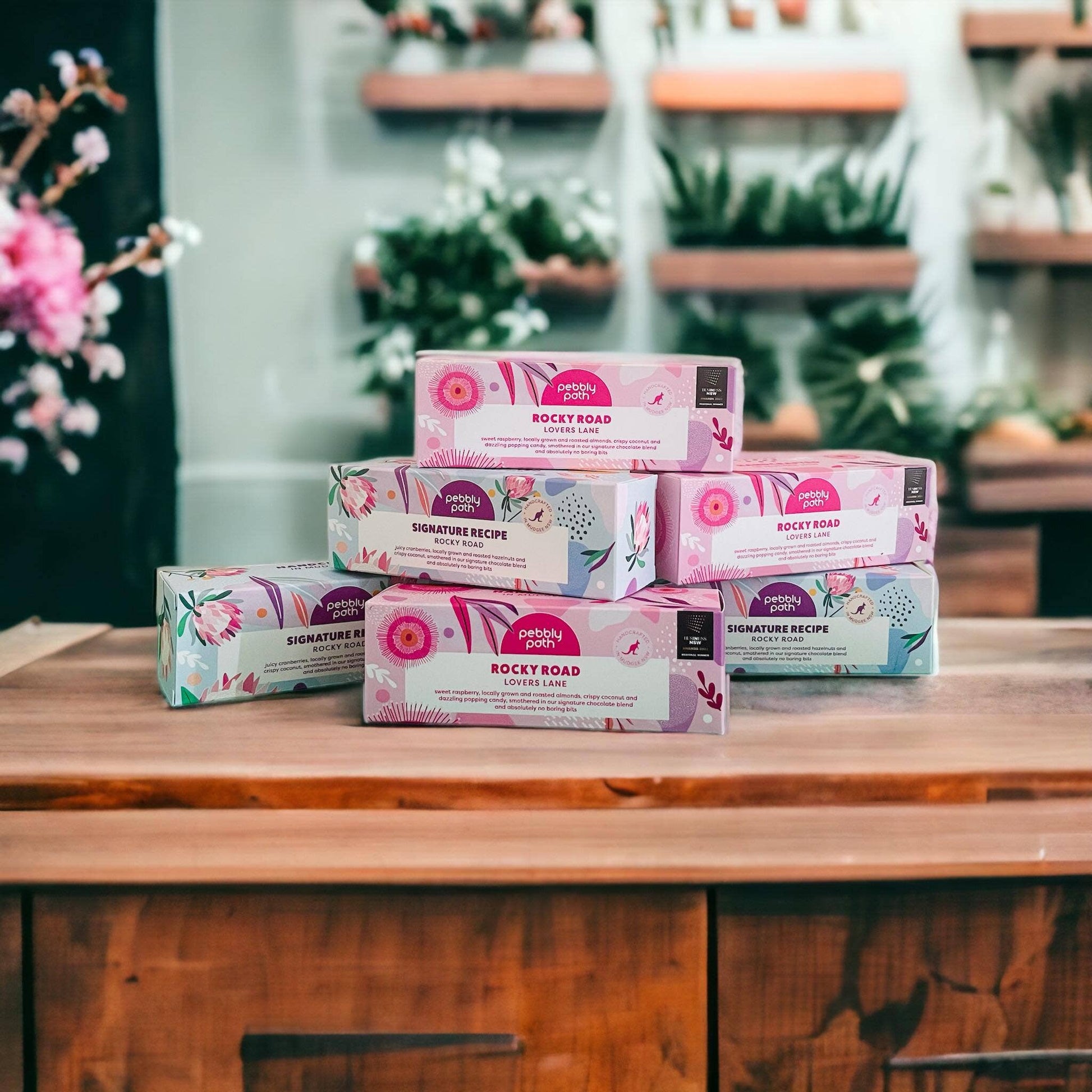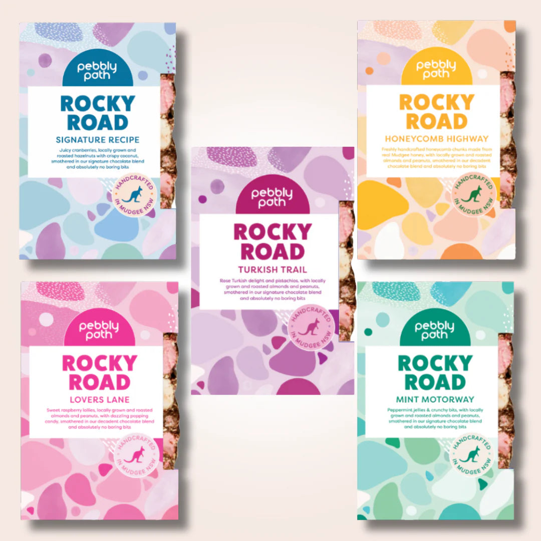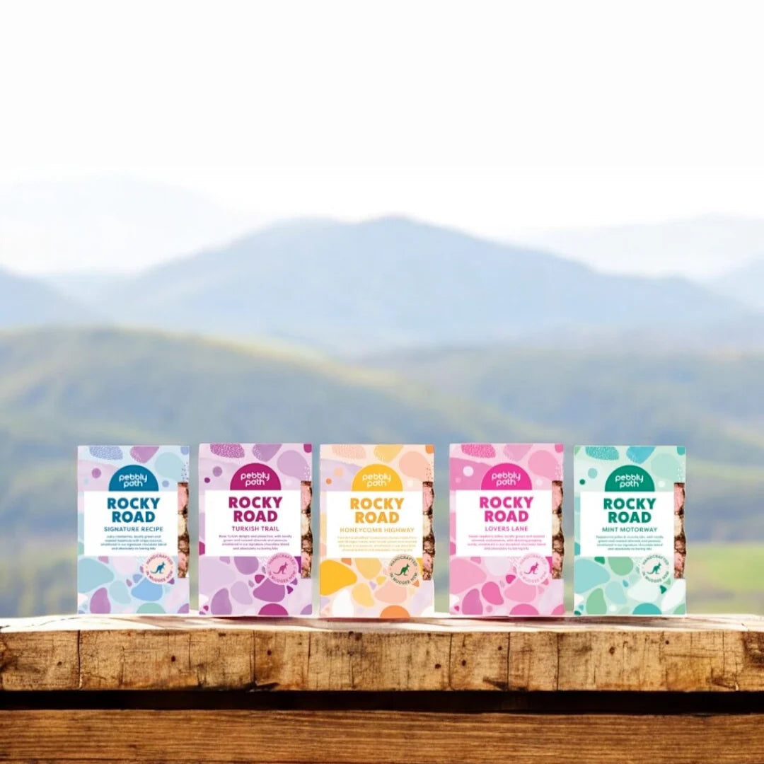 Pebbly Path is extraordinary rocky road made especially for people who hate boring bits. It’s rocky road, but not like you’ve ever had before. Handcrafted in small batches and made in Mudgee NSW, we use locally sourced ingredients, and all our packaging is 100% home compostable and biodegradable.