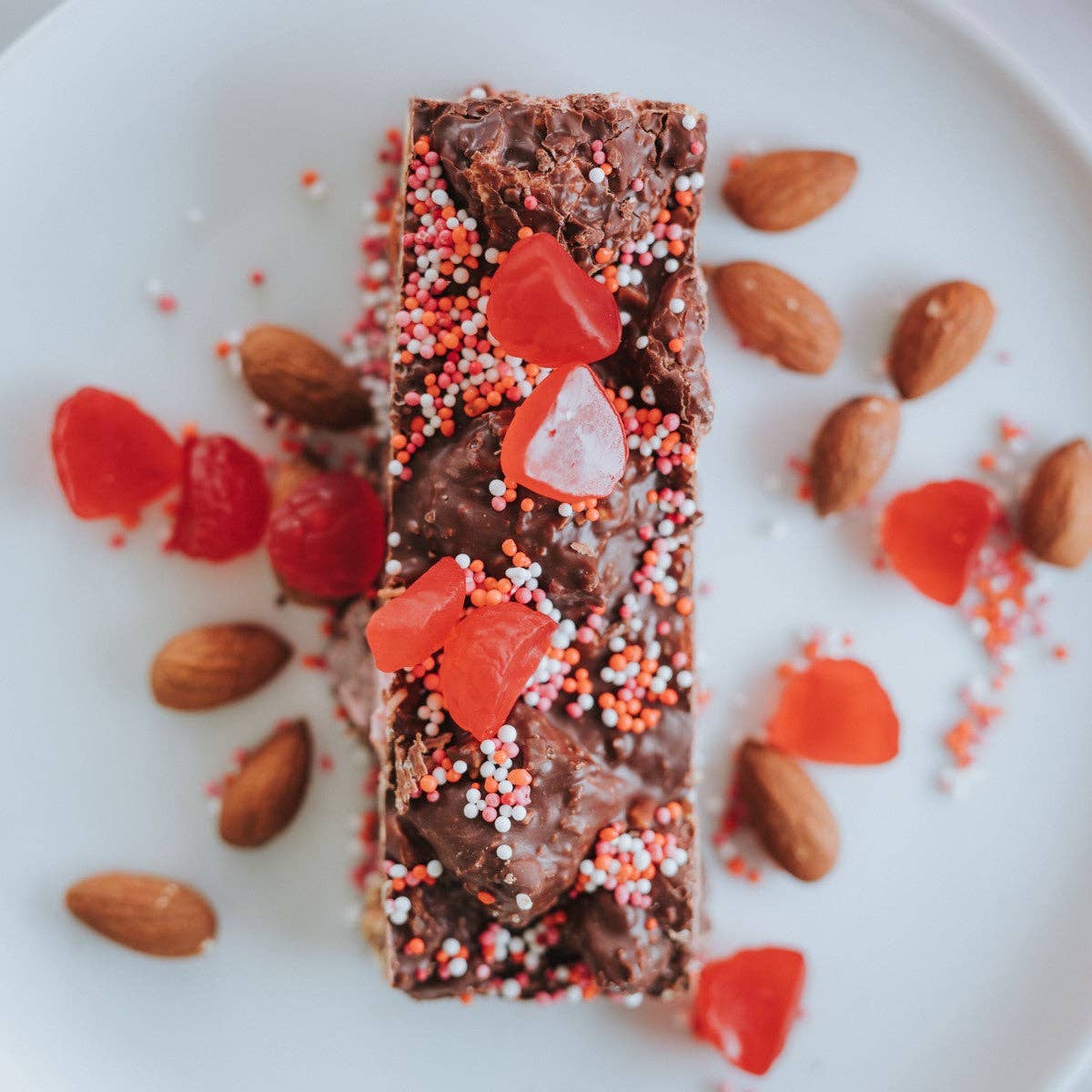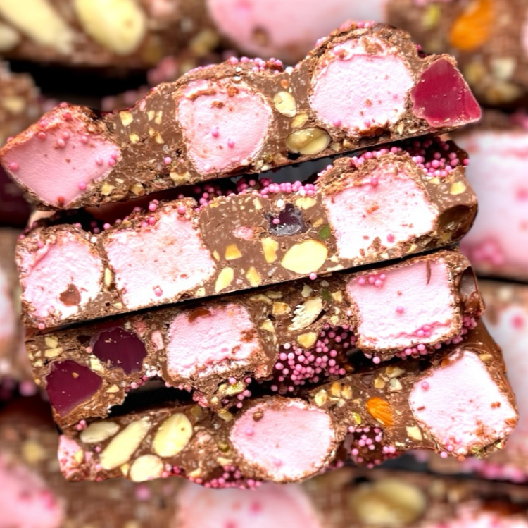 Lovers Lane is bursting with luscious raspberry lollies, fluffy raspberry marshmallow, toasted coconut, freshly roasted almonds from 'Outback Almonds' on the Darling River, peanut chunks and the added surprise of popping candy - this rocky road is as exciting as it is delicious. Wildly popular because of the flavour alone, in addition to it's cheeky throw back to the best memories of your childhood, our Lovers Lane is adored by chocolate lovers of all ages.