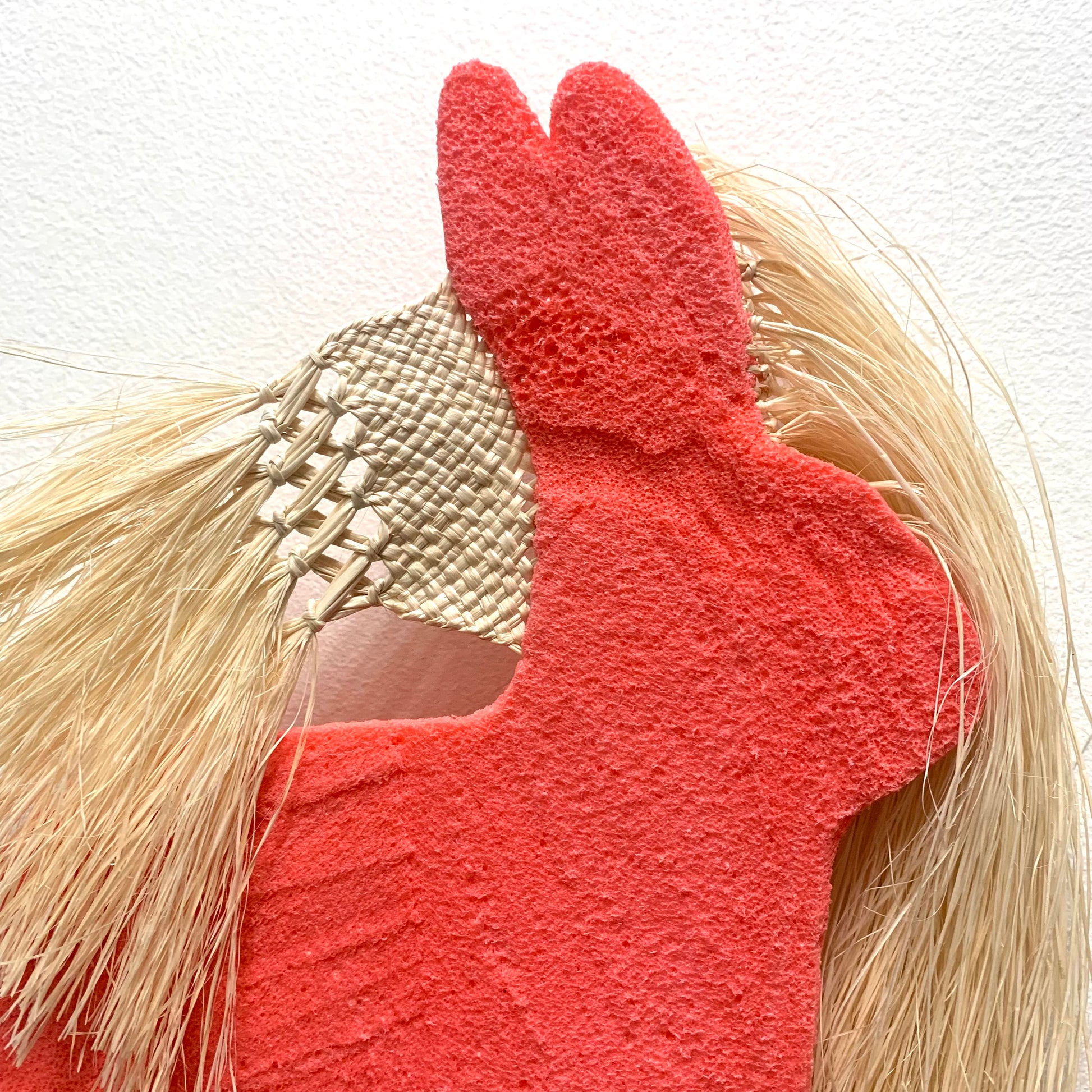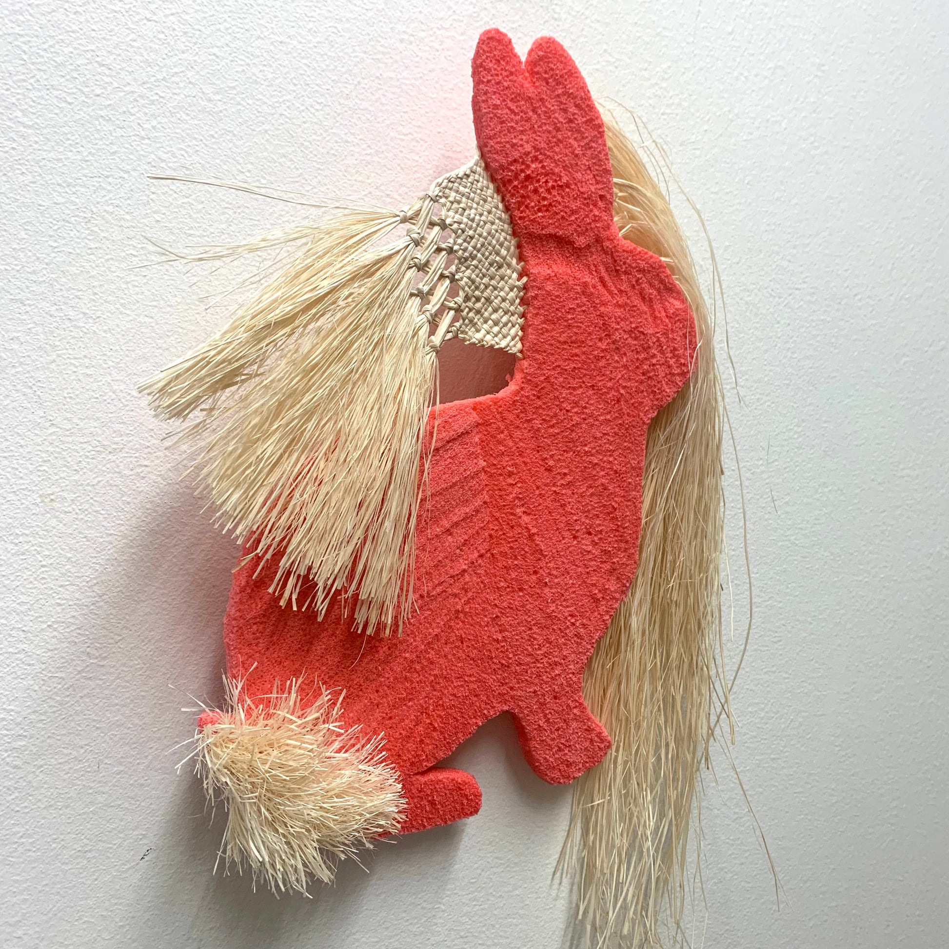 These small wall-mounted rabbits are carved from discarded pink marine floats, collected on and around the artist’s island home.