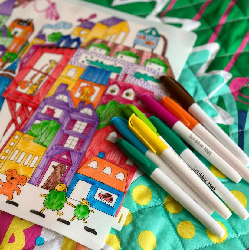 Enhance your child's colouring masterpieces with our vibrant set of 12 dry-erase pens, specifically curated to bring a burst of colour to your Scribble Mat.