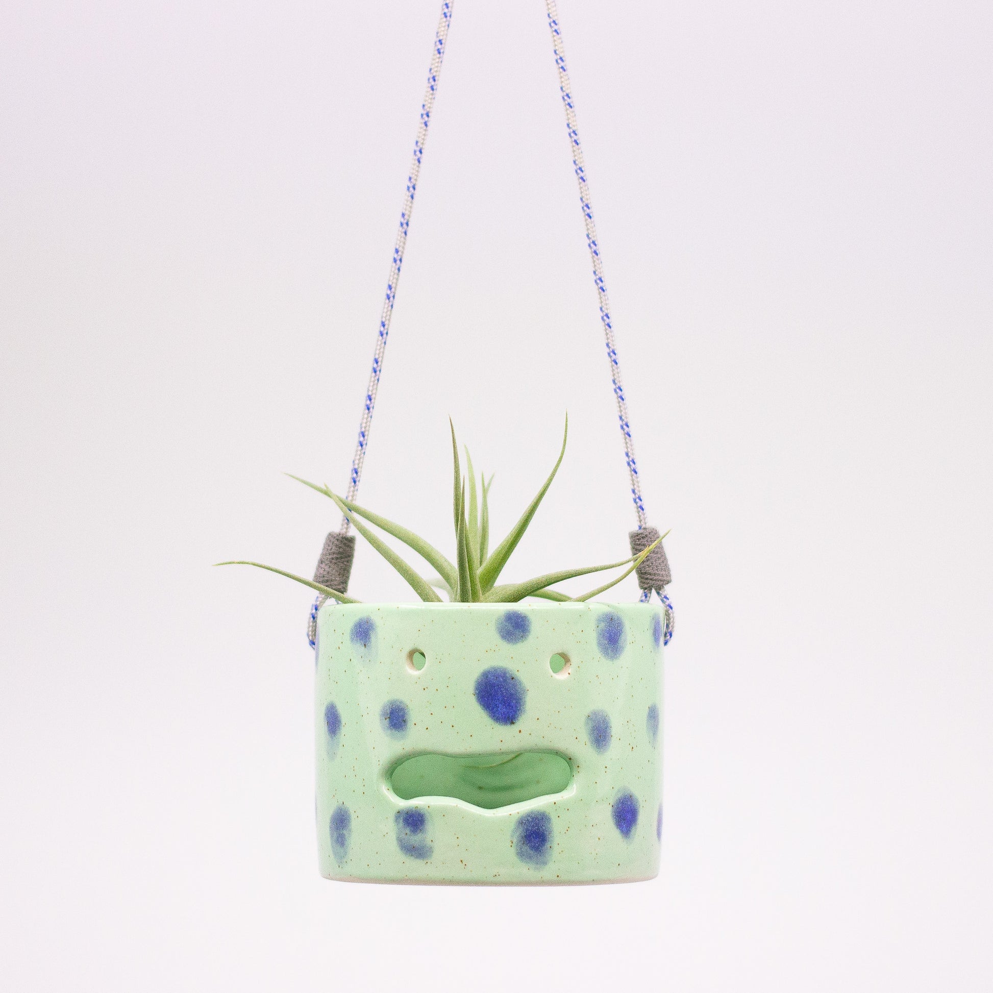 Taru is unique with their brightly spotty pattern and happy look! Taru is happy and having fun as a fearless hanging planter. With a vibrant colour and face, Taru loves to carry an air plant whilst hanging out. Taru is entirely handmade, hand painted, and crafted by shuh. Taru's hanging chord is also hand stitched by shuh.Â