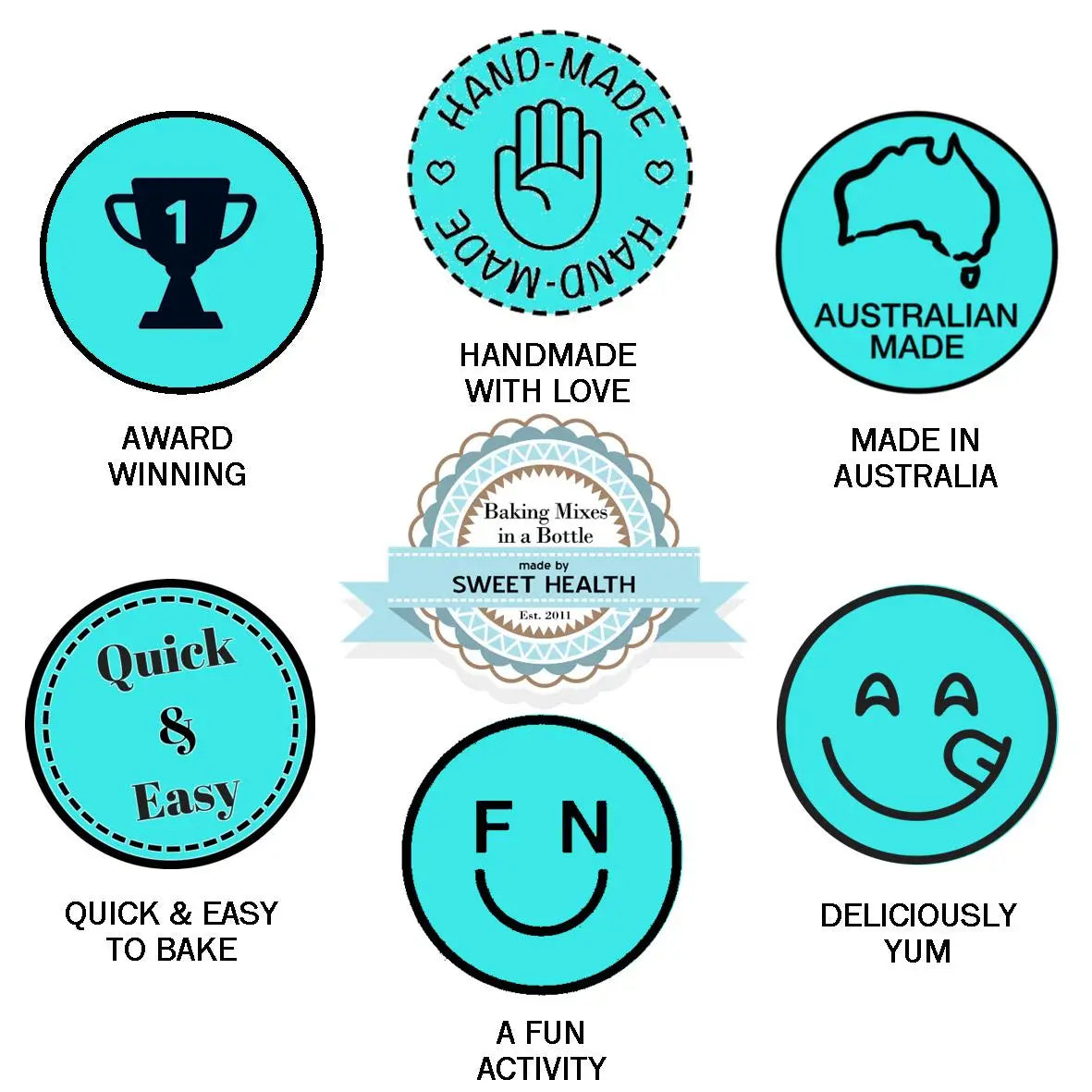 Sweet Health is a multi-award-winning small business based in Sydney, offering a boutique range of artisan baking mixes — each Mix beautifully layered and presented in a vintage-style reusable glass bottle. Handcrafted with love, our Mixes are designed to bring joy from the moment they’re seen to the very last bite.