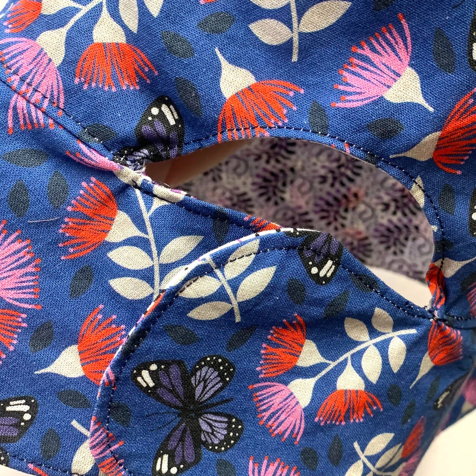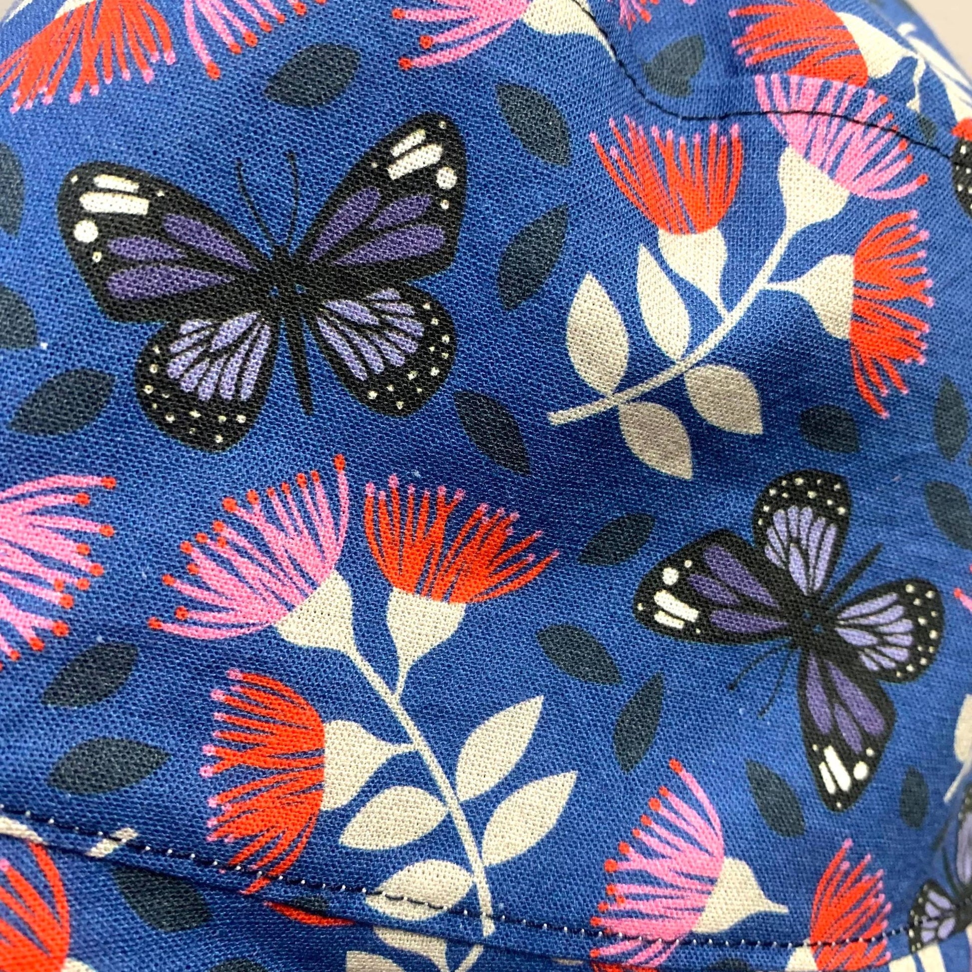 Butterflies & Gum Flowers print with Pony Tail Fabric Hat with a Black and Purple Paisley print fabric lining and velcro fastening.