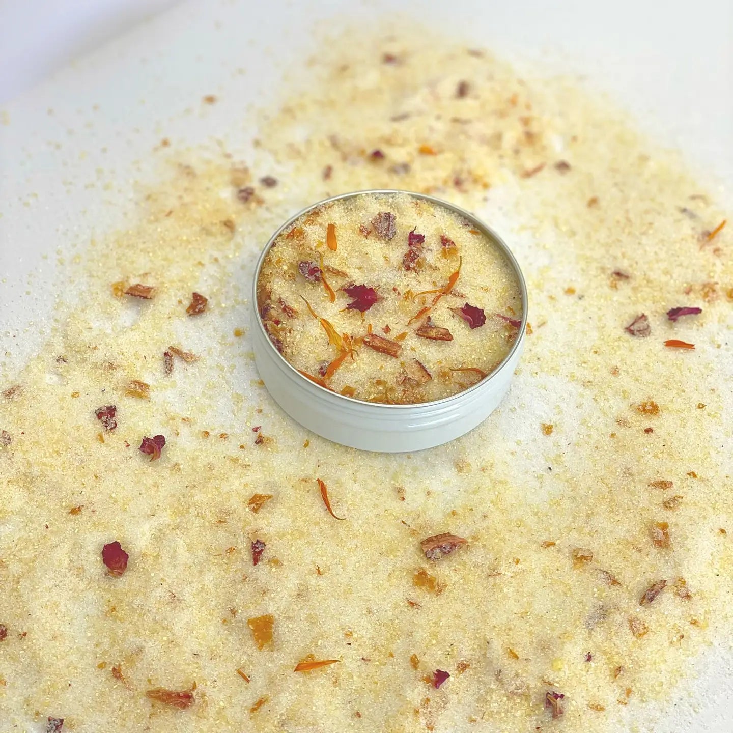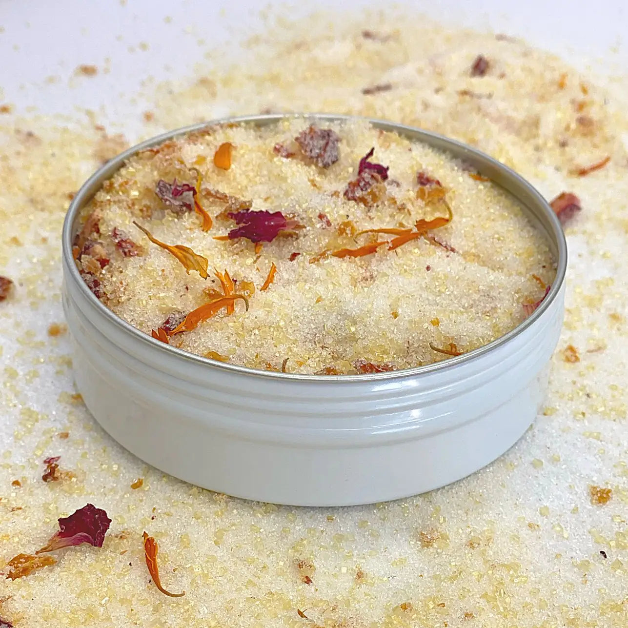 Ingredients: white and gold sugar, dried orange + blood orange, rose petals, calendula, passionfruit