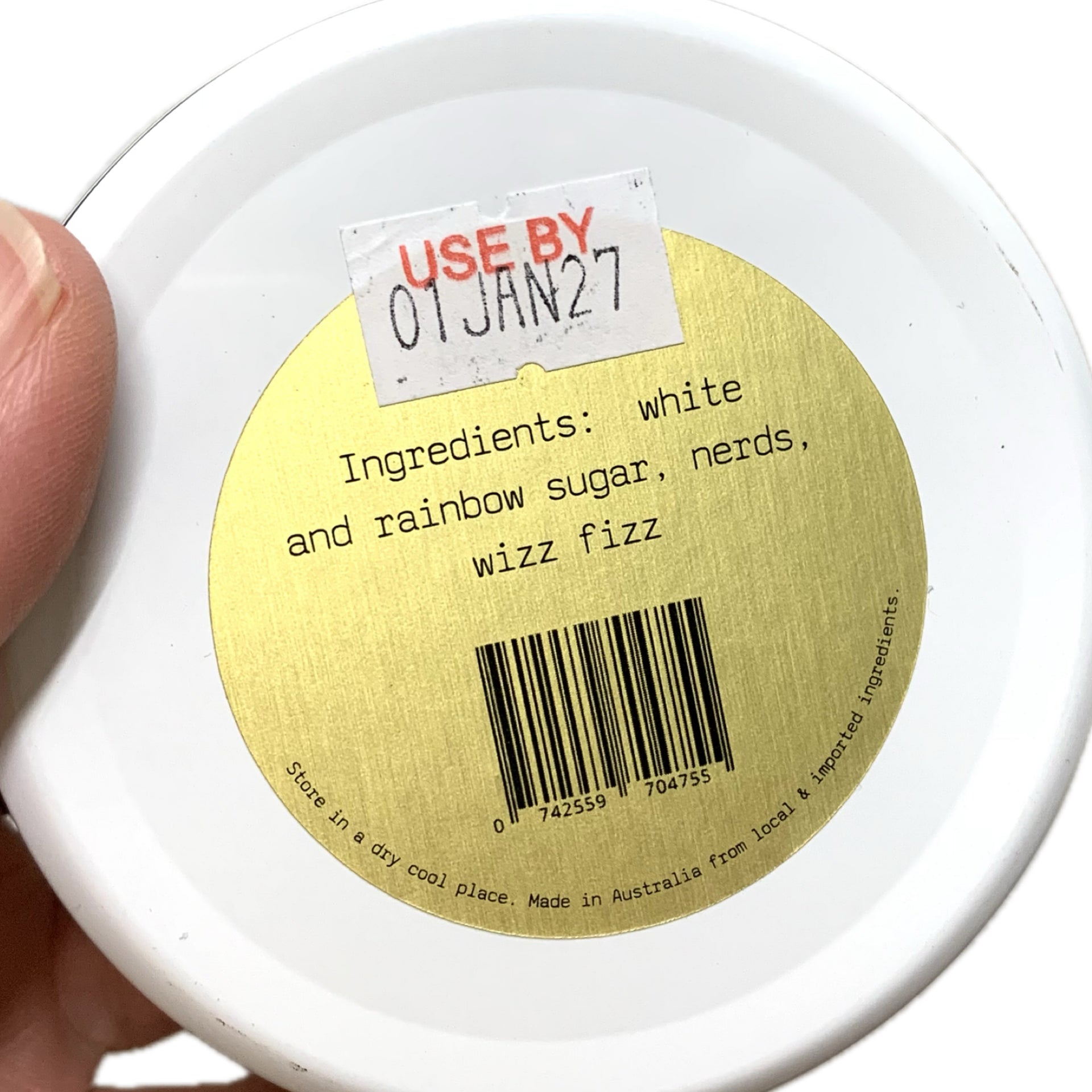 Ingredients: white and rainbow sugar, nerds, wizz fizz