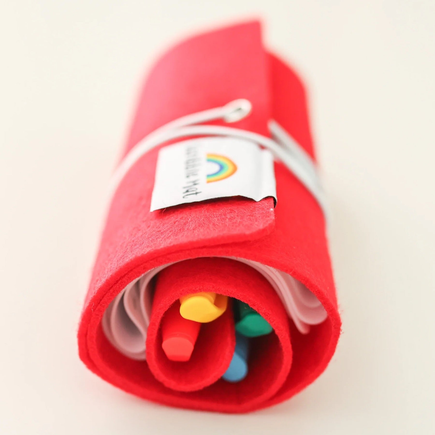 The perfect amount of pens for colouring on the go. Just enough for colourful designs, not too many to keep track of in a busy cafe or doctors waiting room. Each pen has its own slot in the durable felt roll-up case, helping little ones keep track when packing up.