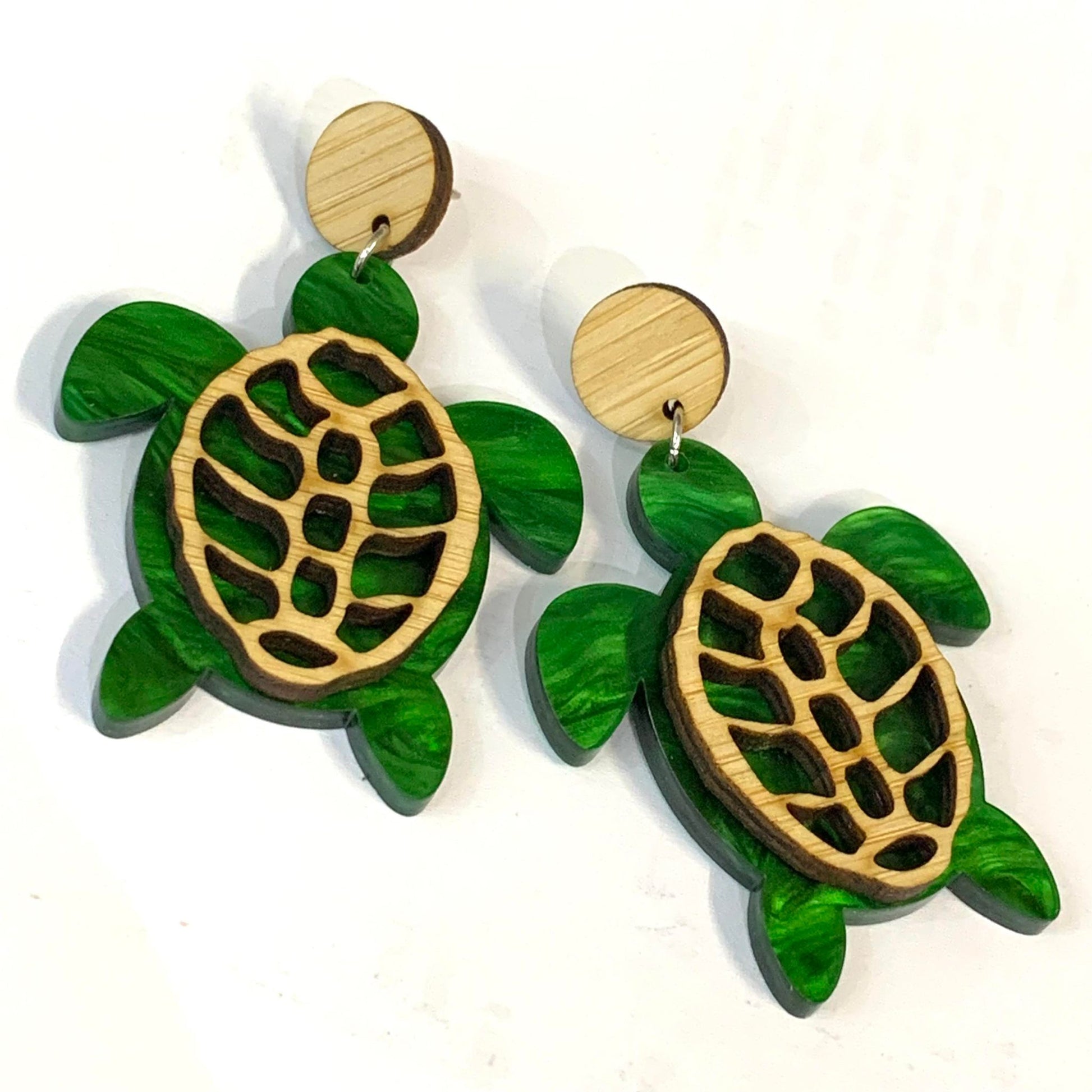 Materials: 3mm thick acrylic adhered to 2mm thick acrylic or bamboo. Surgical stainless steel jumprings, posts and butterfly backs.