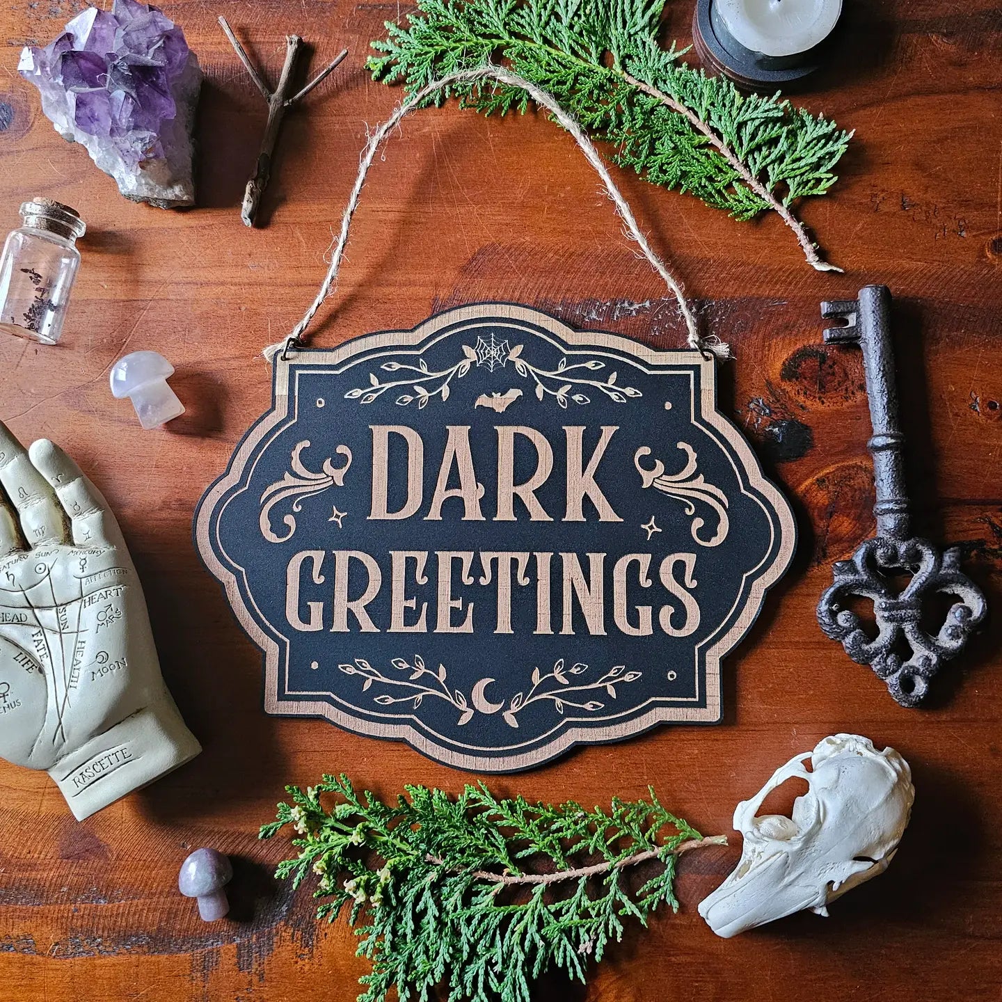 Welcome guests with a touch of darkness and a hint of mystique with our "Dark Greetings" decorative sign, perfect for your entryway or incorporated in a gothic gallery wall. Finished with rustic twine, these signs measure approx 20cm wide and 15cm tall.